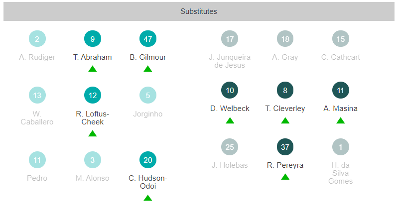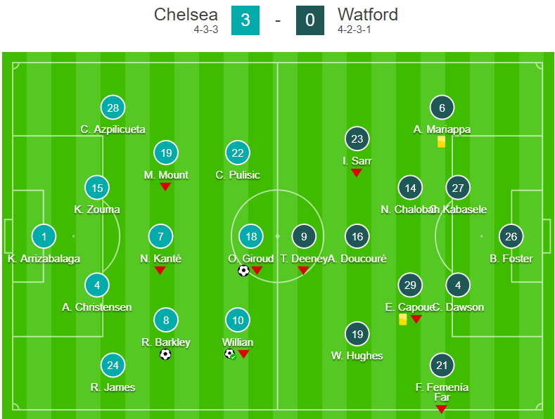 Olivier Giroud was one of four changes to the side by Lampard, and he marked his return to the side with the opener, finding the bottom corner with a left-foot shot (28) to break the deadlock. The Blues doubled their lead two minutes before the break as Willian converted from the spot following a foul by Etienne Capoue on Christian Pulisic.