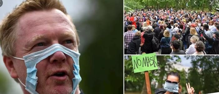 Demonstrators raised placards reading during the Hyde Park gathering. The protest countered an announcement that masks must be worn in shops and supermarkets from Friday.